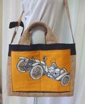クラシックカーがプリントされた布団側をポケットに丸帯芯を柿渋染めした布を使い作りました。