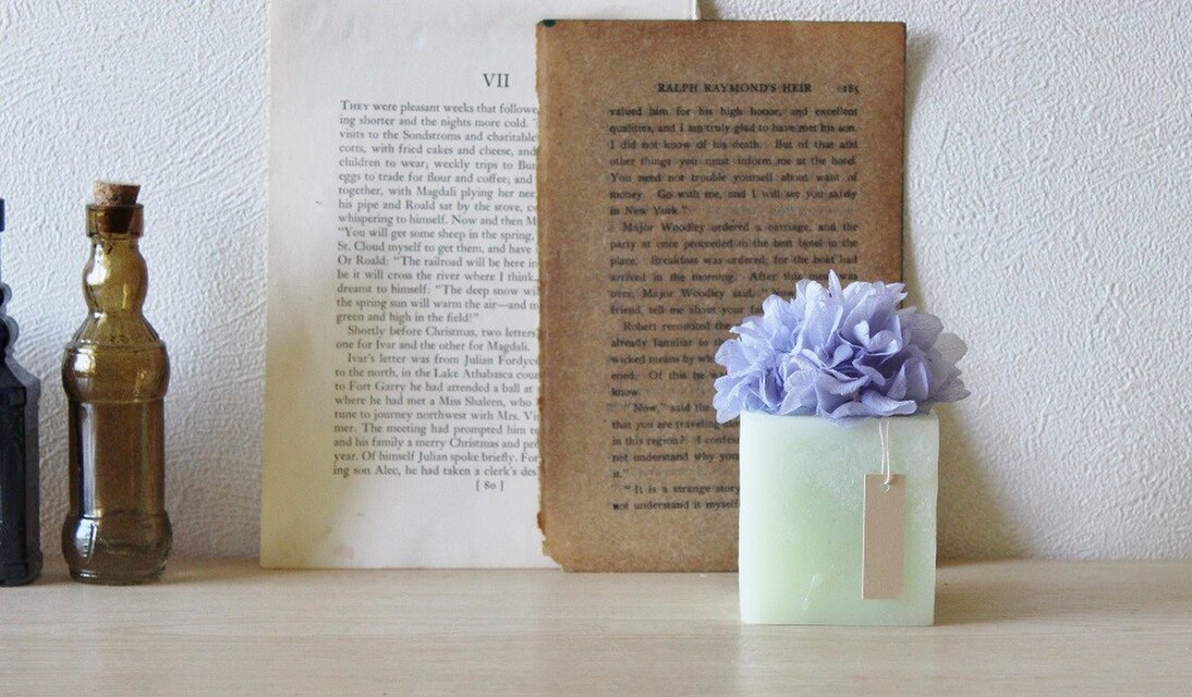 ワックスベースの独特な色とニュアンスブルー色のアジサイでアンティークな雰囲気の作品ができました。