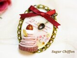 アンティークゴールドの台座に、オフホワイト色に着色したUVレジンを流し込み硬化→その上にブラウンの英文字と小花柄のシートを置き、透明のUVレジンでコーティングし、表面はツヤツヤに仕上げています。