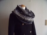 グレイ系の手編み糸を組み合わせて編んだ、かぎ針編みのスヌードです。