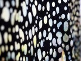 ろうけつ染めのコットン生地で、黒地に青みがかった生成りのランダムドットが、雨だれのように見えます。