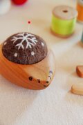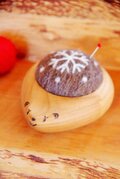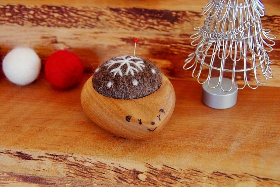 天然木(岐阜県 飛騨産)の山桜を丁寧に削りだして作ったはりねずみのカタチの器に、羊毛をフェルティングニードルを使って、フェルト状に刺し固めたものを入れて作った、こだわりのピンクッション(針山)です。