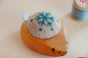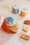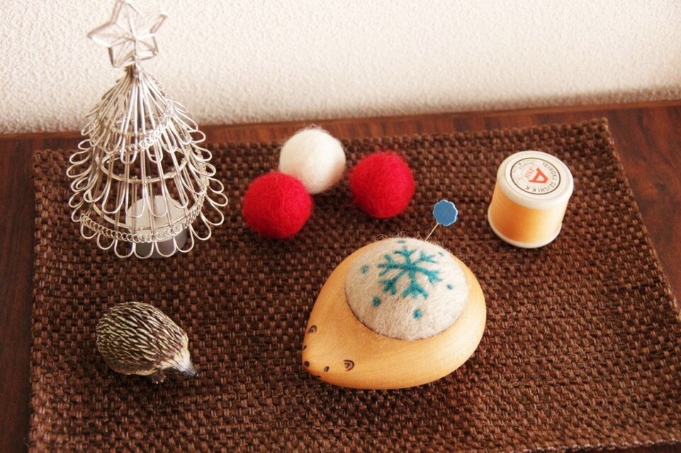 天然木を削りだして作った器に、羊毛をフェルト状に刺し固めたものを入れた、ピンクッション(針山)です。