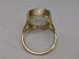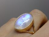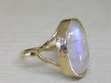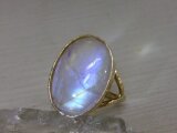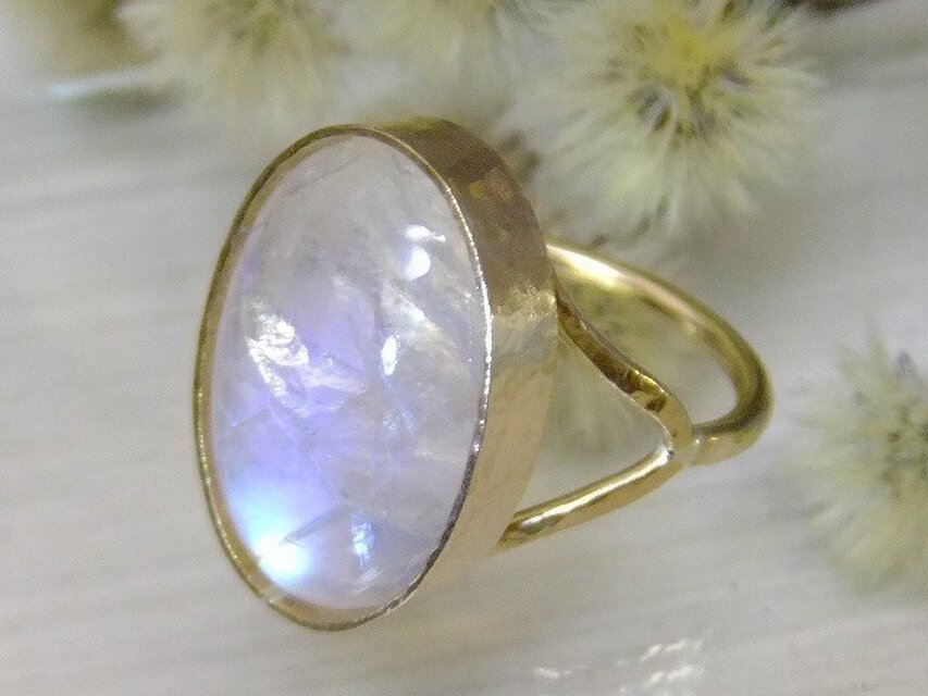 インパクト大の大粒レインボームーンストーン=ホワイトラブラドライトのアンティーク調14kgfリング*大粒なだけにサイドにブリッジを入れて安定感~指馴染みを良くしてあります*このサイズですからクラックもありますがかなり透明度が高く上質、ルース右下(写真3枚目)に直線の虹が架かっており実物はもっと青いシラーが出ます*現状は縁が立っていますがサイズ確定後に鎚目を施しつつ石留めします*インスピレーションや感受性を高めたり奇跡的な事柄を呼び込むといわれる石です*掲載品を9~18号(推奨サイズ)の範囲で調整可能です。