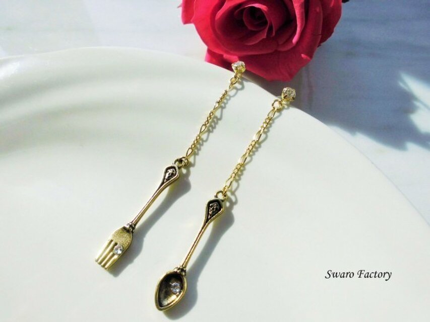 キュービックジルコニアがついたピアスに、スプーンとフォークがついたピアスです。