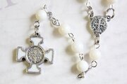 クロスとセンターパーツは「聖なる十字架」と「聖ベネディクト」のリバーシブル仕様です。センターパーツは白いエポキシ樹脂を使用し、ホワイトコーラルとの相性もぴったりです。