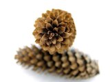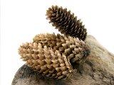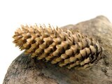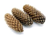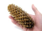 枝から垂れ下がってつく円柱形の球果(松ぼっくり)は、世界のトウヒ属の中ではもっとも大きく、長さ10〜20cm、径3〜6cmほどもあります。高いところに生りますが、たわわに実っていてよく目立ちます。松ぼっくりの中でも、独特の形状をしていて、上から見るとダリアの花のようにも見えます。その存在感のある松かさは色、形ともに美しく、リース素材としてだけではもったいないほど、インテリアやショップディスプレイにむいている素材です。