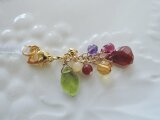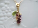 グロッシュラーガーネット(マロンブリオレットカット)、アメジスト、琥珀色ビーズ、アラゴナイト、赤めのう、チェコガラス(リーフとドロップ)、金属メロンビーズ、丸カン、ハート型引き輪、デザイン丸カン、アーティスティックワイヤー、Tピンなど。