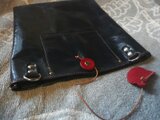 入口の留め具は革封筒などにあるような赤い直径2センチの丸革をカシメで付けたものを