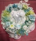・白にシルバーラメが散りばめられたリーフのリースに、パステルブルー・グリーンのバラとパステルブルーと白のグラデーションアジサアジサイ・パステルグリーンのアジサイを組み合わせたリースです。