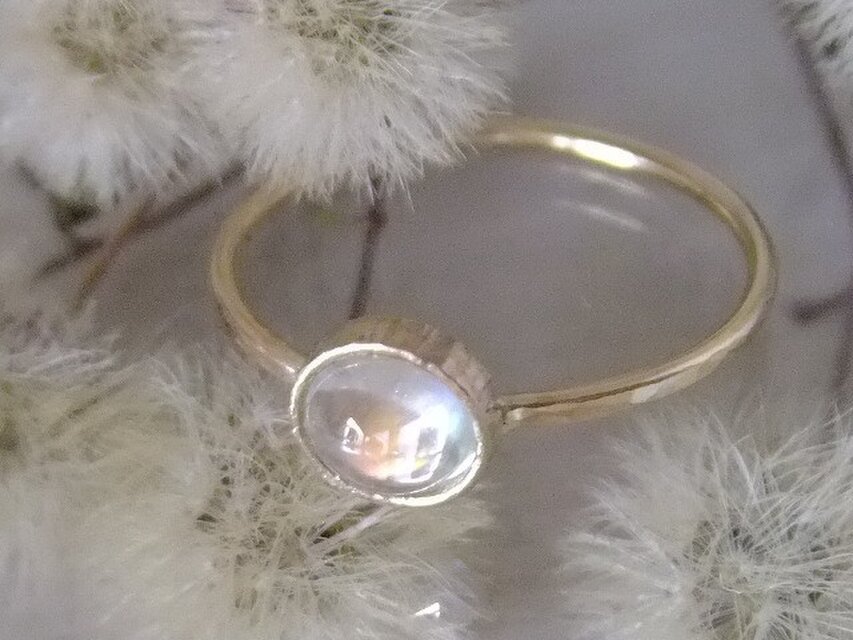 小粒ながら強いオレンジシラーがとても可愛いゴールデンムーンストーン(レインボーアンデシンラブラドライト)を華奢でシンプルなアンティーク調の14kgfリングにしました(縁が立っていますがサイズ確定後に石留めします)背景の綿毛が良く見えるほどの高い透明度で正面にオレンジ色の強いシラーが現れます*レインボームーンストーン=ホワイトラブラドライトとは全く別の石です*殆どが小粒のルースで1ctを超えるものは大きいといえるほどでゴールデンと称されるようにムーンストーン界では最上位の希少性を誇ります*ムーンストーンらしい穏やかさの中に確かな強さを感じられるようなシラーです*3~13号(推奨サイズ)の範囲を目安に調整可能です。