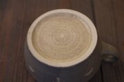 益子白土を使い、色化粧土を外側に掛け、それを薄く削って、地の土の色を出して模様にしています。