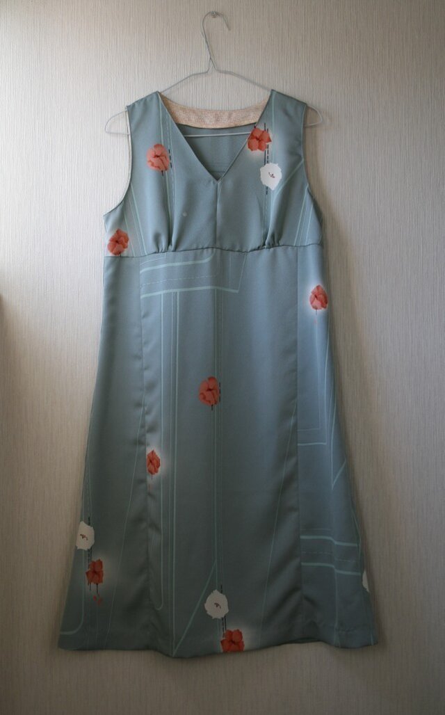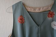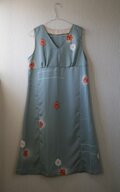 9800円→5200円にお値下げ致します。(2015年2月) -------------------------------------------------------------------------------------------- 昭和から平成頃に作られたと思われるの着物を丁寧にほどき、洗い、シンプルなノースリーブワンピースを作りました。スモーキーなグリーンの地色の中にオレンジ色のひなげしが描かれたデザインが可憐な生地です。