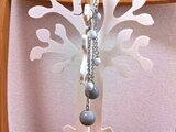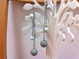 グレー色のアクリルボールと白色の天然石・マグネサイトを使った、6つのボールが踊るように揺れるピアスです。
