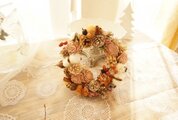 ピンクベージュのソーラーローズに松かさなどの実物・cottonを使いXmasとしても