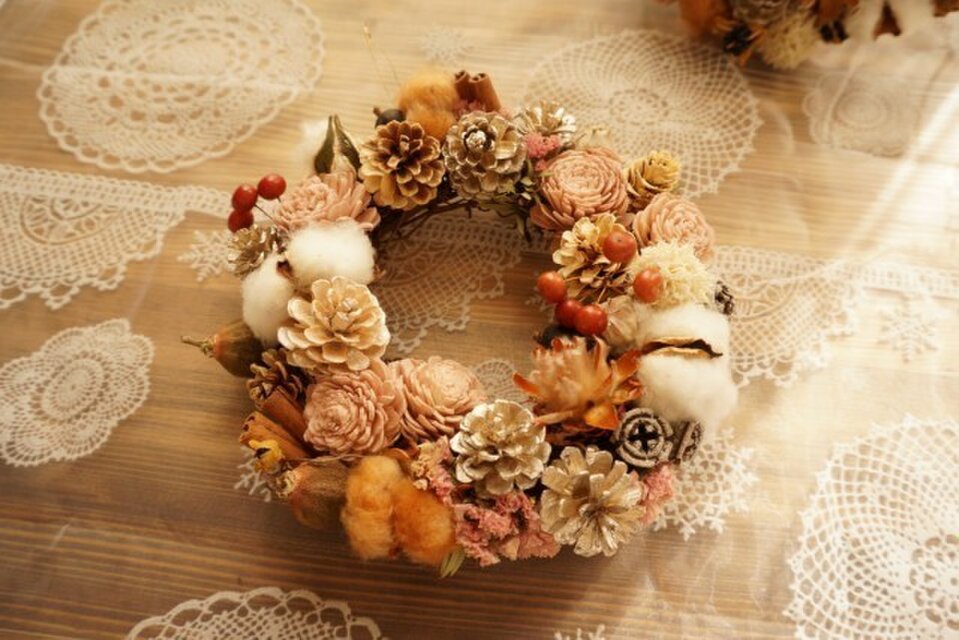時間と共に退色していきますが、よりナチュラルなリースへと変わっていく様子もお楽しみいただけたらと思います。