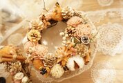 ピンクベージュのソーラーローズに松かさなどの実物・cottonを使いXmasとしても