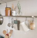 ホワイトとモスグリーンの糸でちくちくをしたなべつかみです。