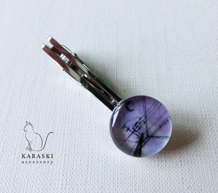 夜明け空に電柱を描いた絵を、樹脂で閉じ込めたネクタイピンです。