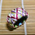 土台に真綿(絹)を巻き締め、その上から一針一針、色とりどりの絹糸でかがっていき模様を出します。