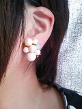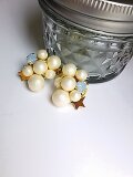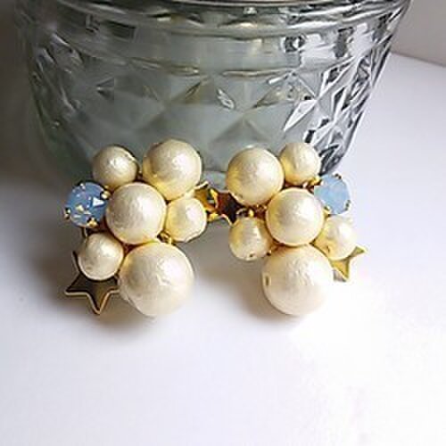 6mmと8mm玉のコットンパールに2種類のサイズの星プレート、そしてスワロフスキーがキラリと光る全体的にボリューミーなデザインのピアスです。