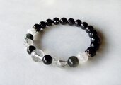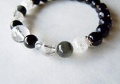 ◆ラウンドカットの水晶を中心に、オニキスとトルマリンクォーツ、グレータイガーアイにクラッククォーツを並べたブレスレットです。