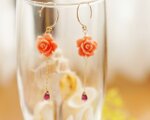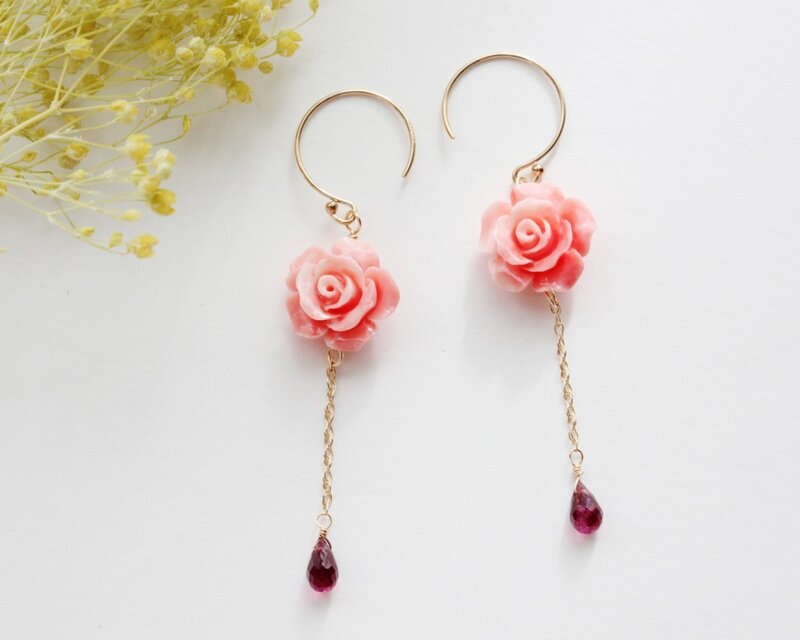 フリルのようにひらひらとした質感が可愛らしいバラのパーツに宝石質のロードライトガーネットを一粒。