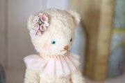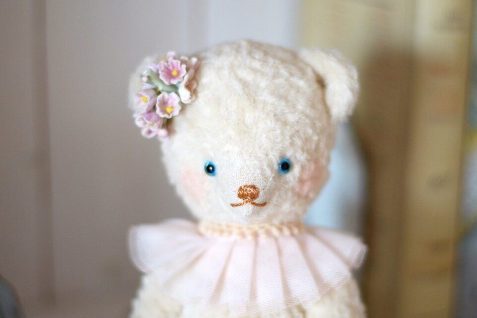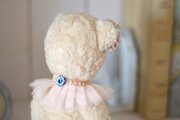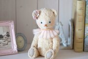《材料》紅茶染めビスコース•スエード•ブルーのグラスアイ•ポリエステル綿•ペレット•チュールラッフルリボン•ヴィンテージフラワー•ヴィンテージボタン•コットンレース