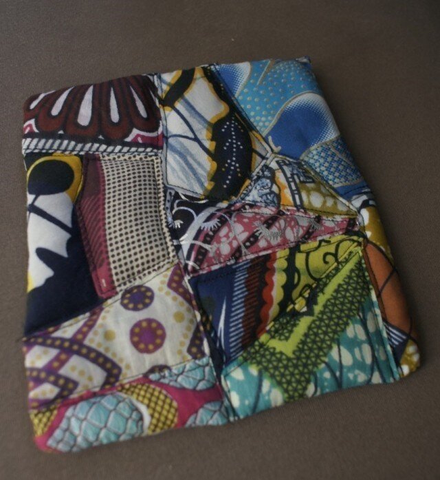 表はカラフルなパッチワーク、裏はコーヒー豆柄のパーニュです。
