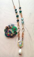 アンティークに近い古いラフカットに大粒のボトルグリーンのカットビーズととてもニュアンスのあるコーティングがされたガラスビーズをコッパーがかったブラスチェーンで繋ぎました。トップはヴィンテージのコットンパールとチェコの古いイコンの様なボタンをセット、裏面は古いメダイユになっています。