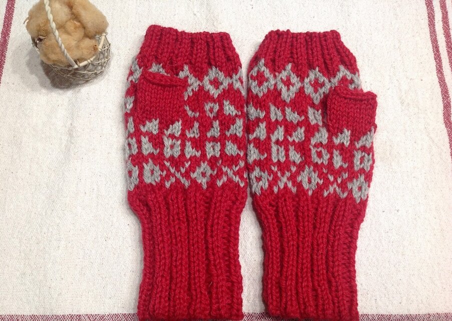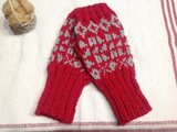 赤をベースにライトグレーでフェアアイル柄を編み込んだ指なしの手袋です