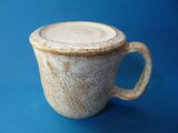 冷めにくいように蓋つきのマグを作りました。蓋はティーバックを置いたりクッキーを置いてもいいですね。常滑のおぼろ土です。削りをして土味を出しています。表情が豊かなチタン釉薬をかけています。