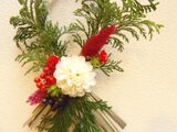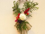 真っ白のポンポンギクと赤の実物がとても可愛らしいしめ縄です
