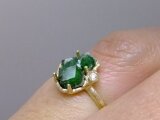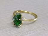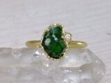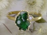 極めて色の濃いグリーングロッシュラーガーネットの原石に煌めきを演出したダイヤモンドを添えました*希少な濃色の結晶原石による色味と天然のカットが美しいです*深いグリーンが映えるアンティーク調K18リングです*5~15号(推奨サイズ)の範囲を目安に調整可能です(現在、爪が立っていますがサイズ確定後にシッカリ滑らかな石留めを致します)