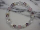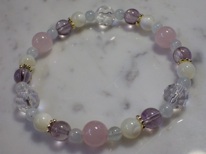 こちらはローズクォーツ(8φ)+アメジスト(淡色 6φ)+アクアマリン(4φ)+マザーオブパール(6φ)+水晶(多面カット 8φ)を組み合わせたパワーストーンファッションブレスになります。
