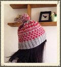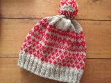 ライトグレーに鮮やかな赤でフェアアイル模様を編み込んだ帽子です