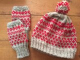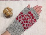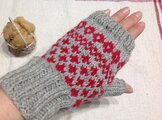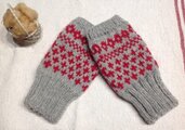 ライトグレーをベースに赤でフェアアイル柄を編み込んだ指なしの手袋です