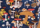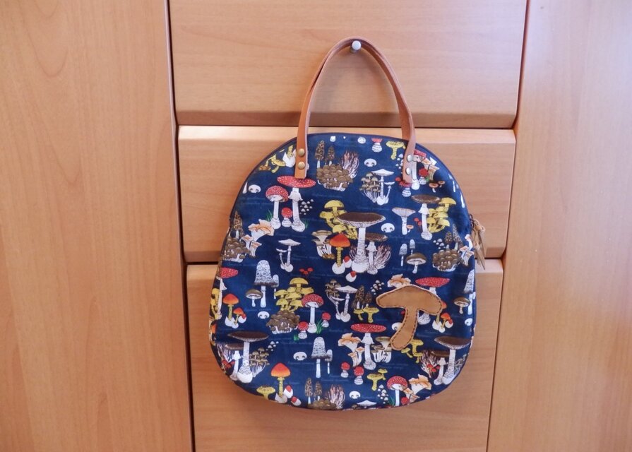 リアルなきのこのプリントが楽しいコットンオックスで、洋ナシのフォルムのファスナー手提げを作りました。