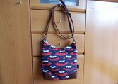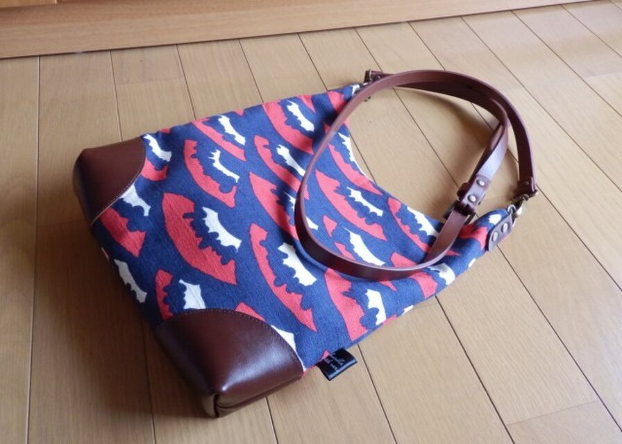 インパクトの強いトリコロールカラーの富士山のコットンプリントとあずきのような色の牛革で、ちょっとしたお出かけにぴったりのナナメ掛けショルダーを作りました。