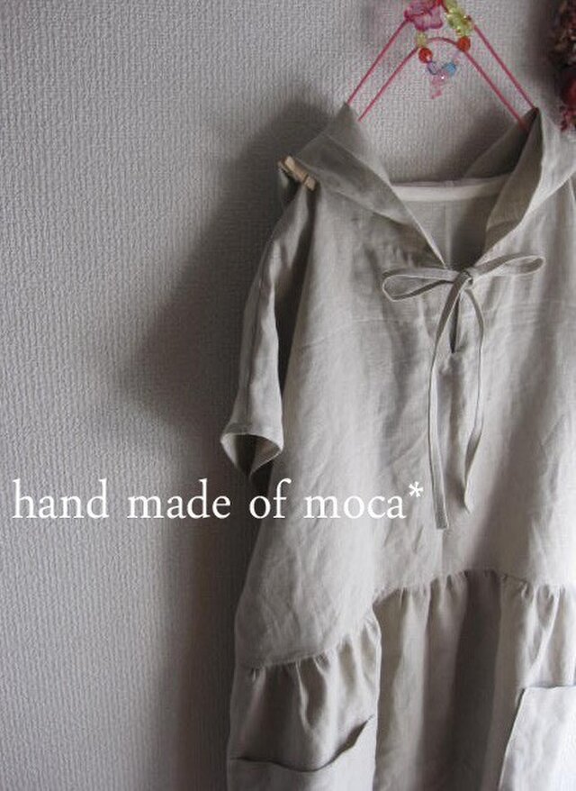 【受注製作/4.22再販売】W50半袖リネン前リボンフード付きワンピース★キナリ