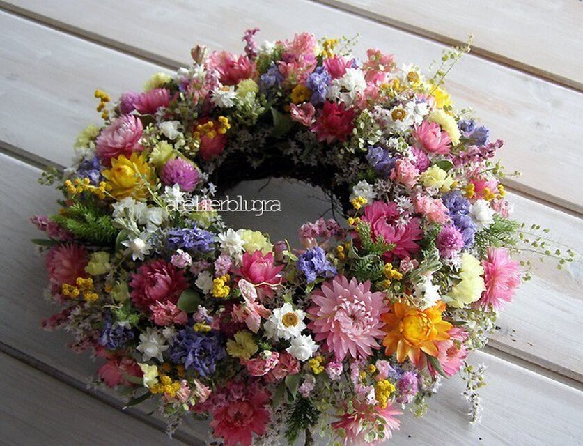 ヘリクリサムやセンニチコウ、ちどり草、センニチコウ。ストロベリーフィールズ、ポアプランツ、スターフラワー、サマーチェリー、ダイヤーズカモミール、タタリカなどを散らした春満載の小花のWreathです。新築のお祝い玄関ドアなど(Welcome Wreath)また、ブライダルではお客差をお迎えするWelcomeWreathにもとても喜ばれる一品です。直径25cmほど。サイズ表記は完成アレンジ外径となります。ギフトラッピング(200円)、先様への直送用の新しい段ボール箱(350円)のご用意がございますので、ご注文の際にお申し付けください。