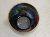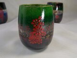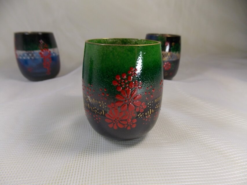 小さいグラスに手描き致しました。もりもりもこもこ赤でお花を描きました。全体を青、黒でシックに。手で持った時の凹凸が印象的です。ボーダー透明部分に金彩模様を施しています。渕も金彩しています。