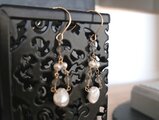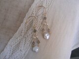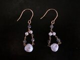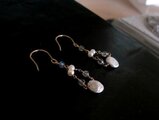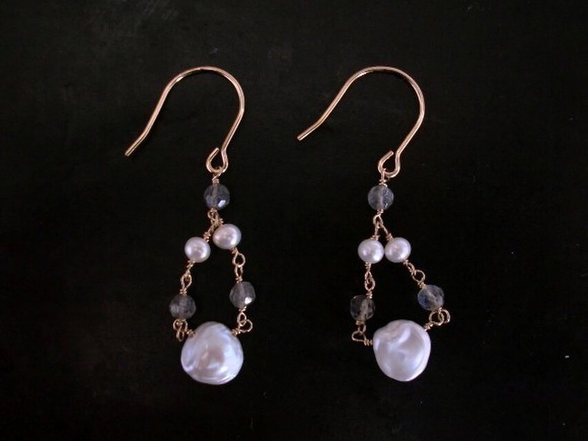 一つ一つ不揃いの花びらのような芥子パールを、大人っぽい落ち着いたラブラドライトとパールでつなぎました。パールの表面の虹のような光沢と青いシラーのラブラドライトが幻想的な雰囲気。小さく揺れるタイプに仕上げました。
