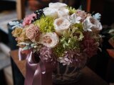 プリザーブドフラワーで制作した淡いピンクとグリーンのさわやかなアレンジメントです