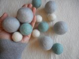 【フェルトボールのサイズ】全13個、直径約2.5cm(ホワイト)、3cm(セラドン)、4cm & 4.5cm(ライトグレー) → ハンドメイドですので多少のばらつきがあります。
