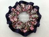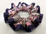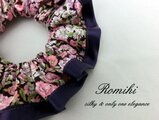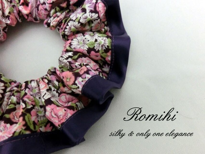 ピンクとパープルの花柄が鮮やかなリバティ生地をパープルサテンで縁取りしたシュシュです♪ボリューム感は少なめですが、洋服の邪魔をしない適度な大きさです♪