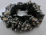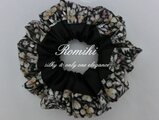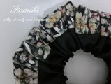 黒地にクレヨンで手書き風の白い花柄がたくさん描かれたリバティ生地と黒いサテンを組み合わせたシュシュです♪シンプルな可愛さが大人向けです。