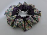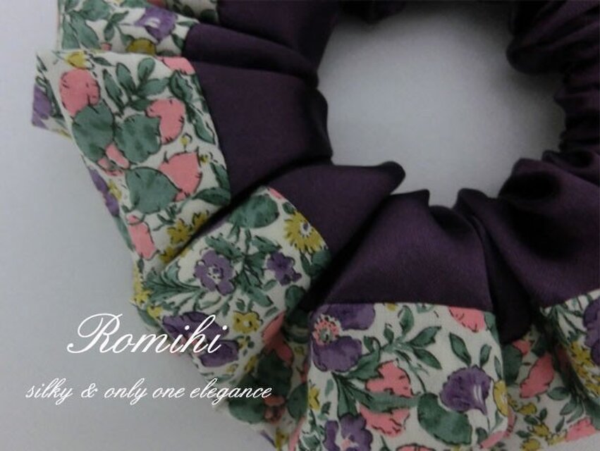 パープルとグリーンとピンクがきれいな花柄のリバティと紫のサテンを組み合わせたシュシュです♪