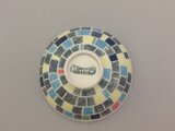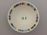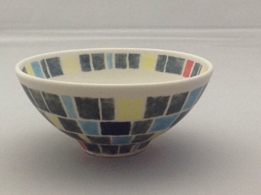 磁器の作品です。ロクロで成型し、絵の具でモザイク柄を絵付けしました。