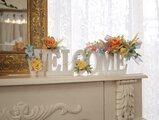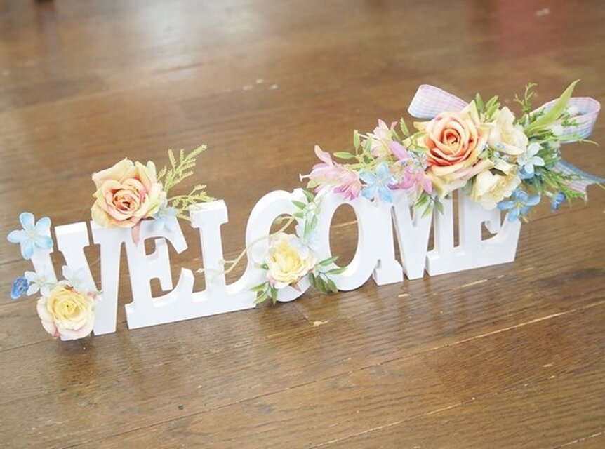 真っ白な木製のウエルカムオブジェに可愛いお花をたくさん飾りました。